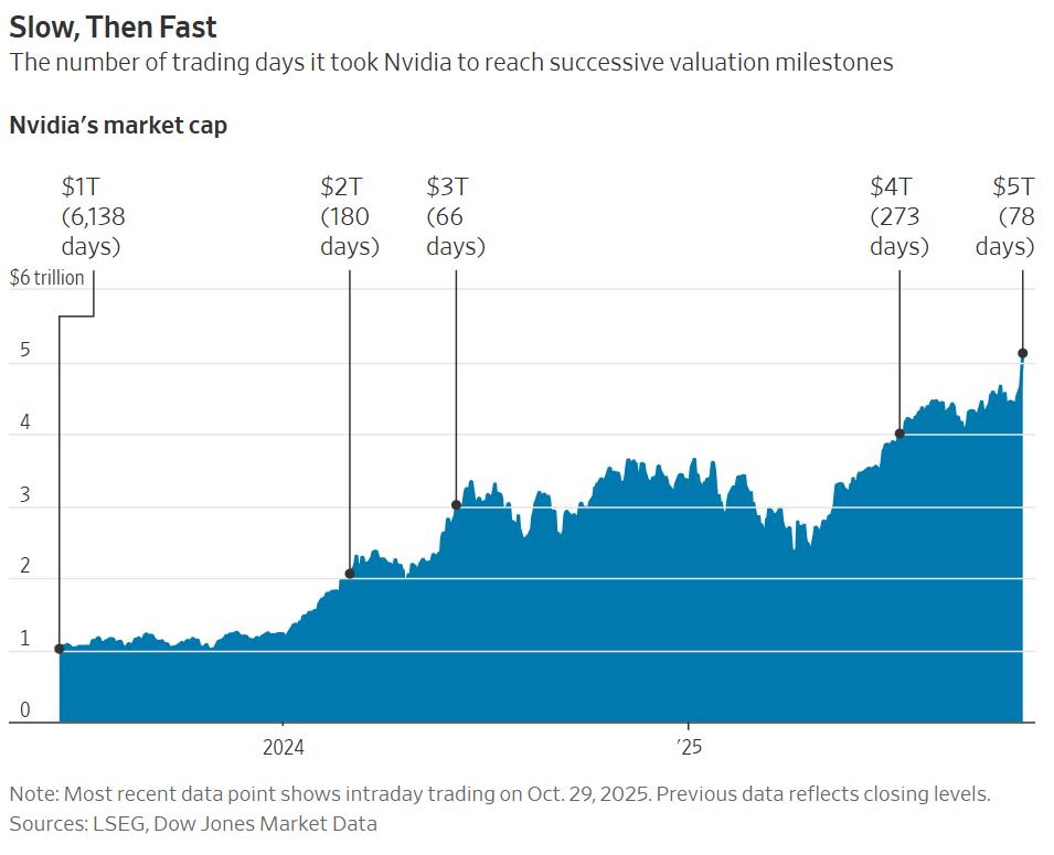 Nvidiaās time to market caps of $3 Trillion and $5 Trillion look highly unnatural compared to historical norms, 66 and 78 days respectively.