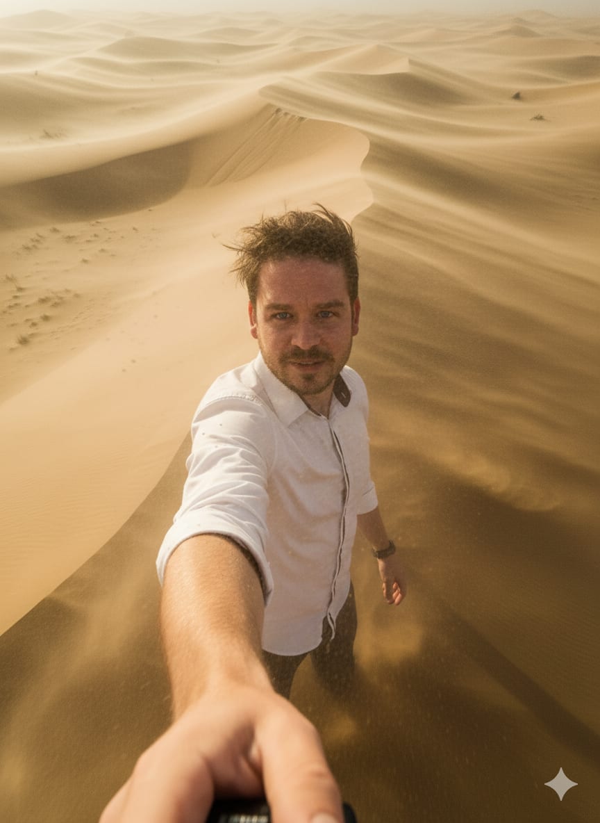 #Role: AI filmmaker specializing in handheld cinematic vlogs. #Task: Transform the uploaded image of me into a scene where I am filming myself during a desert sandstorm. #Context: The subject is holding a camera at armβs length, recording a vlog. The sandstorm is chaotic β wind whipping clothes and hair, sand flying everywhere β but the face remains clear and recognizable. #Examples: Travel vloggers in extreme environments, raw handheld shots where the environment feels immersive and unpredictable. #Format: First-person handheld framing (slightly off-center, close-up), natural armβs-length perspective, harsh golden lighting, sand motion blur, high detail on facial features. #Tone: Urgent, raw, immersive, survival-style.