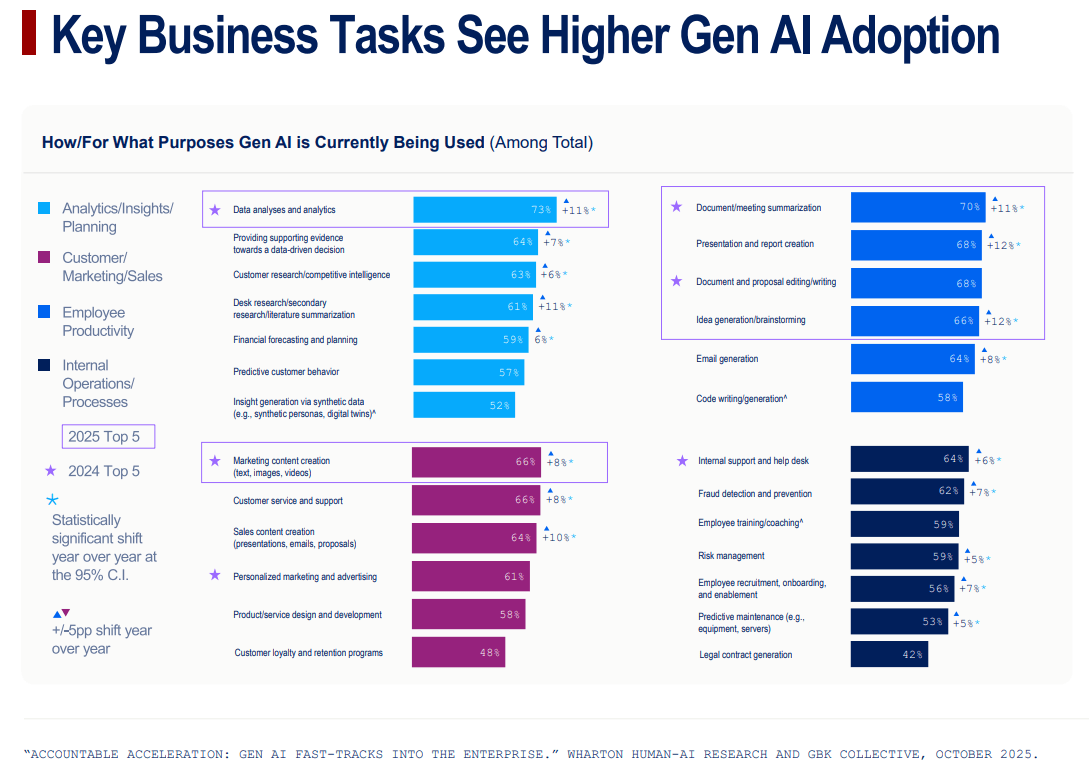 Wharton’s latest Enterprise AI Report shows a clear inflection point in adoption. Surveying 800 senior U.S. decision-makers, the study found that AI budgets are growing across nearly every sector, with 88% of companies planning to boost spending next year. Business leaders now use AI for data analysis, marketing, meeting summaries, and report generation, while tools like ChatGPT and Microsoft Copilot dominate daily workflows.