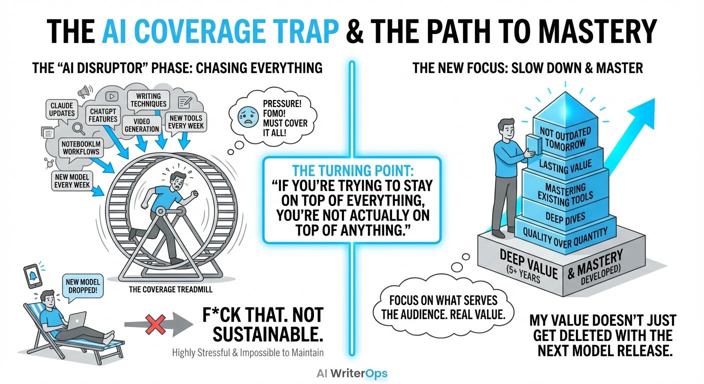 But I couldn’t do that while trying to cover the entire AI world. The work was scattered. The focus was diluted. Nothing compounded because I was constantly jumping to the next tool, the next update, the next trend.