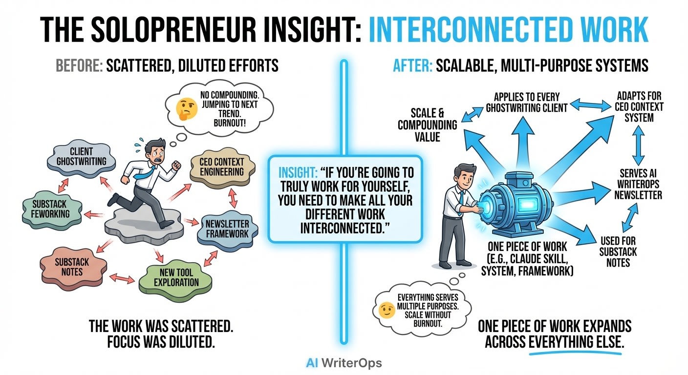 When I build a Claude skill for writing Substack notes for myself, that same skill helps every client I ghostwrite for. When I develop a newsletter framework for AI WriterOps, I can apply that methodology across all my ghostwriting clients. When I create a context engineering system for one CEO, I can adapt it for the next three.