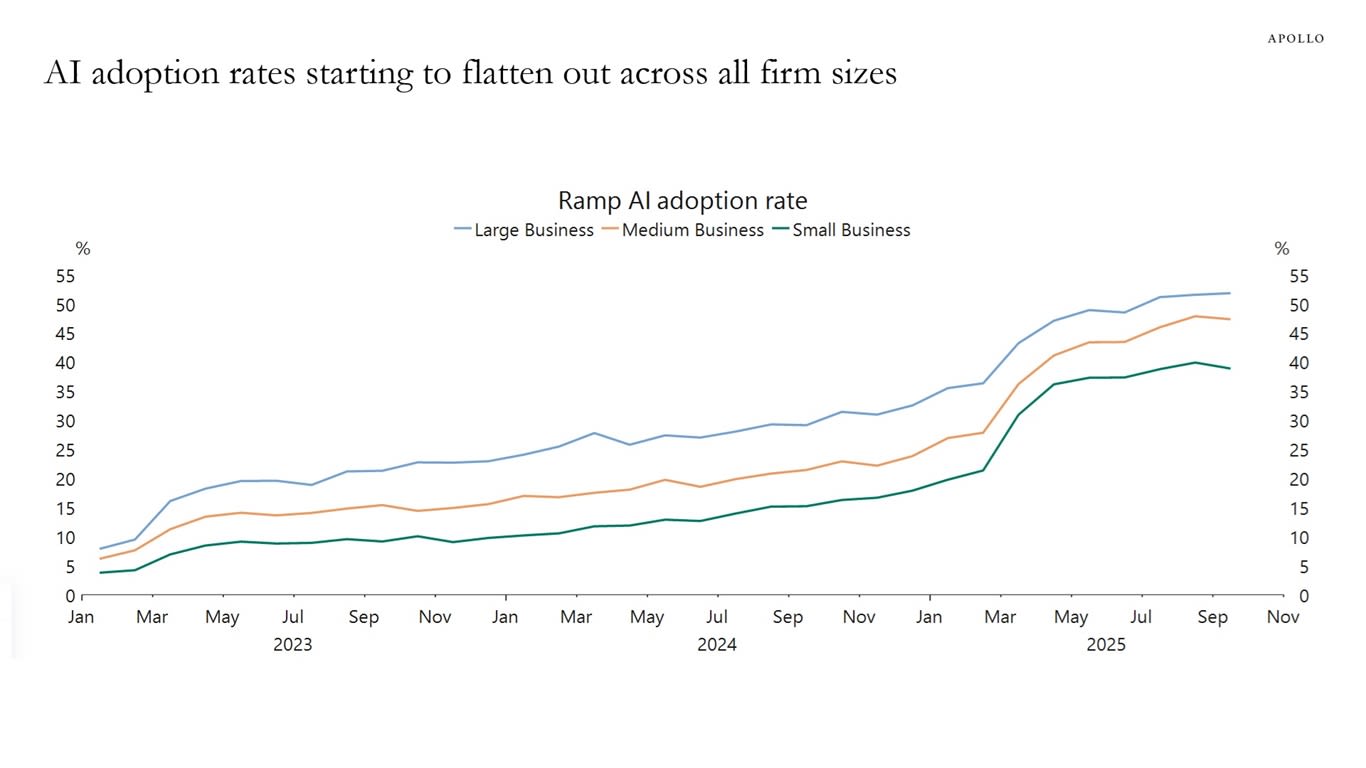 Torsten Slok is Chief Economist over at Apollo. Data from the Census Bureau and Ramp shows that AI adoption rates are starting to flatten out across all firm sizes, see charts above and below.