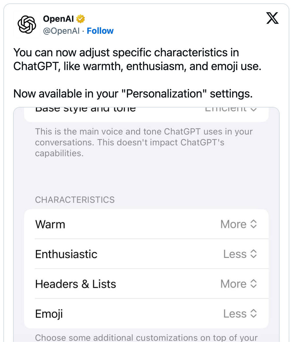 Users can now directly adjust the chatbotโs warmth, enthusiasm, and emoji usage โ no more guessing what tone youโll get.