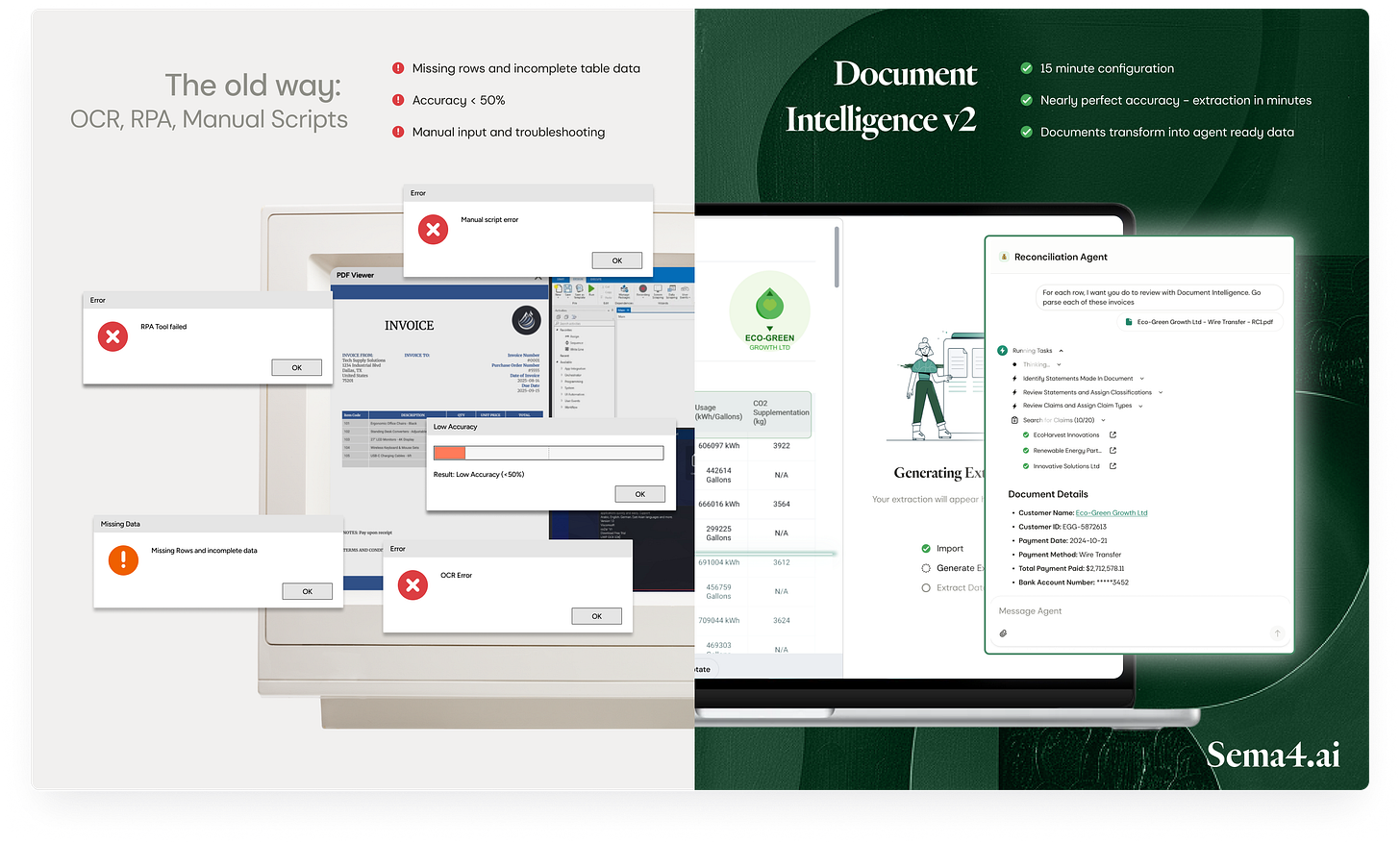 Sema4.aiβs Document Intelligence delivers near-perfect extraction, turning any document into structured, agent-ready dataβeliminating manual work, enabling smarter processing, and scaling accuracy across your enterprise.