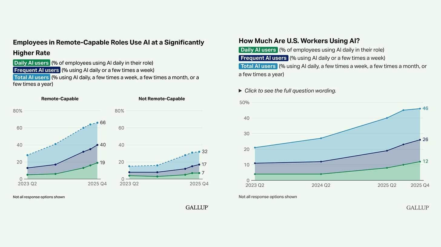 The divide across roles is stark. Remote-capable jobs show 66% AI adoption, with 40% frequent use, compared to just 32% adoption and 17% frequent use in roles requiring physical presence. Leaders are also far ahead of their teams, 69% of managers use AI, versus 40% of individual contributors.