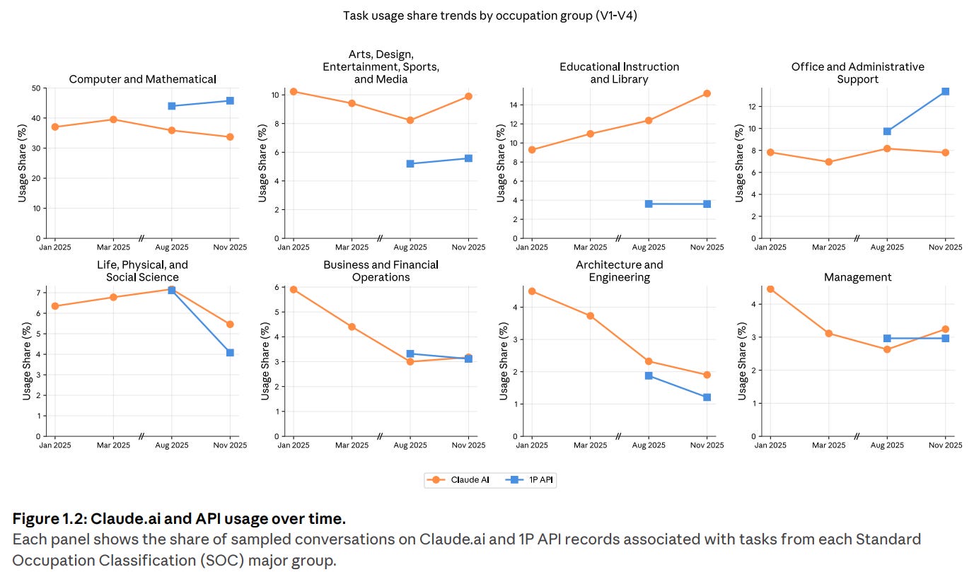 The biggest gains show up where work gets harder. Tasks requiring high-school skills run about 9× faster with AI, while college-level work sees up to 12× speedups. Claude is also getting better at long, complex workflows, successfully completing tasks lasting up to 19 hours about half the time. Coding still dominates usage, but collaboration, learning, iteration, and feedback now outweigh pure automation.