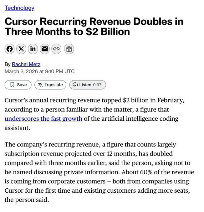 “Anysphere’s (Cursor) annualized recurring revenue (ARR) has skyrocketed from $200 million in mid-2025 to over $2 billion by early March 2026, doubling in just the last three months alone.”