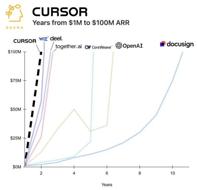 I see a scenario where Anysphere becomes Anthropic’s key competitor. Think about it, Cursor goes from $1B to $2B in 3mos, while Claude Code went $0 to $2.5B in 8mos.