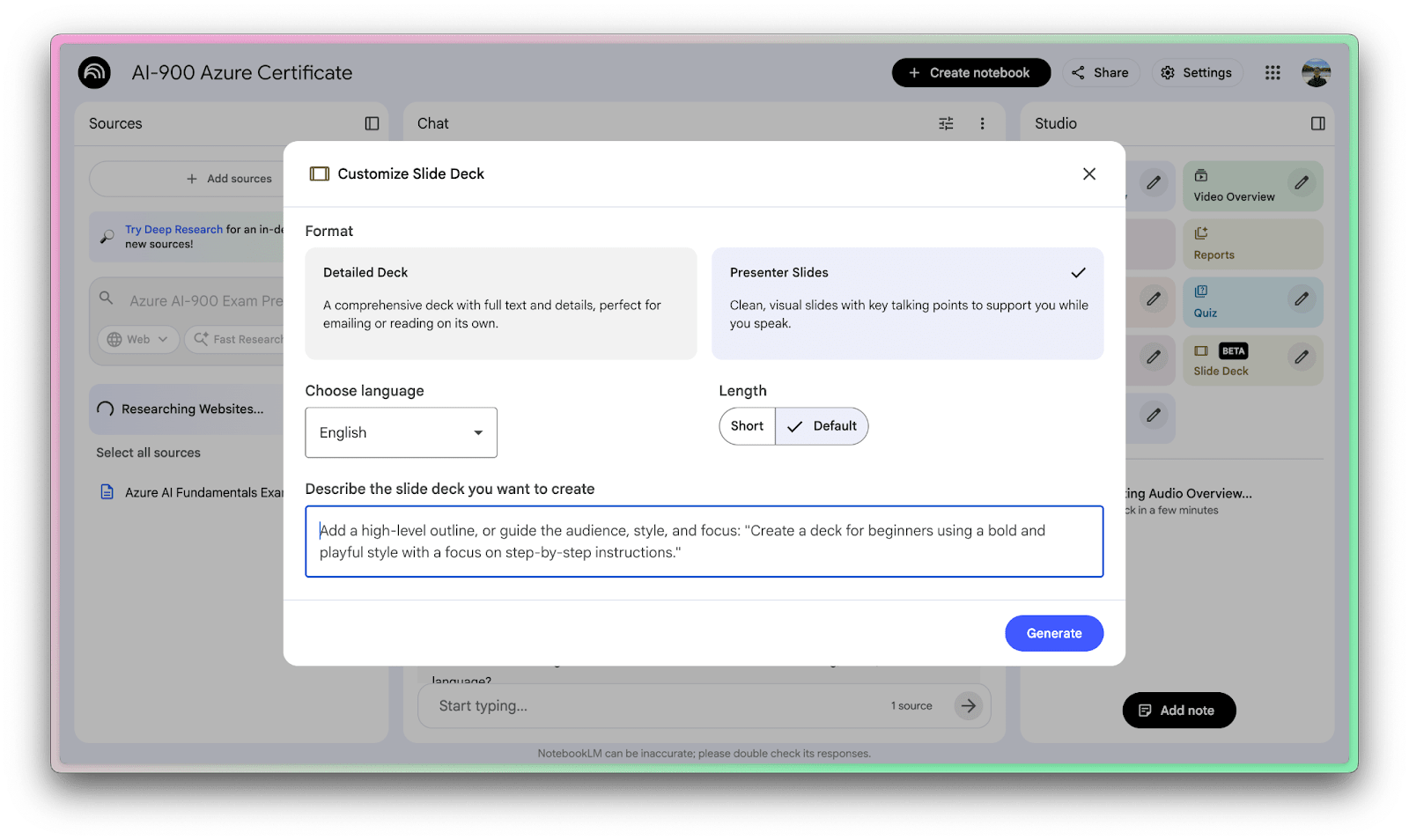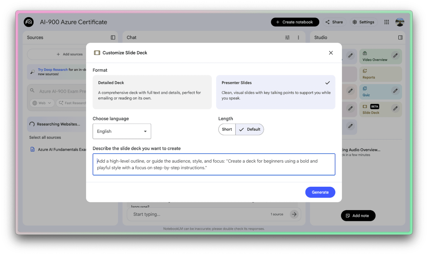 Another cool thing you can do with NotebookLM is to generate professional-looking slide decks from your notebook.