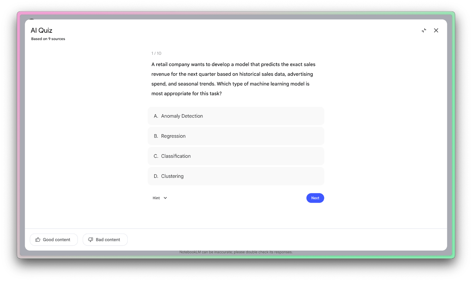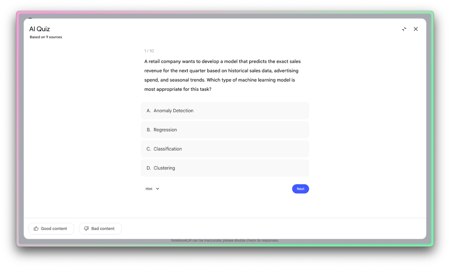 I am always super pleased to use the quiz feature in NotebookLM. It’s my favorite feature, aside from the audio overviews.