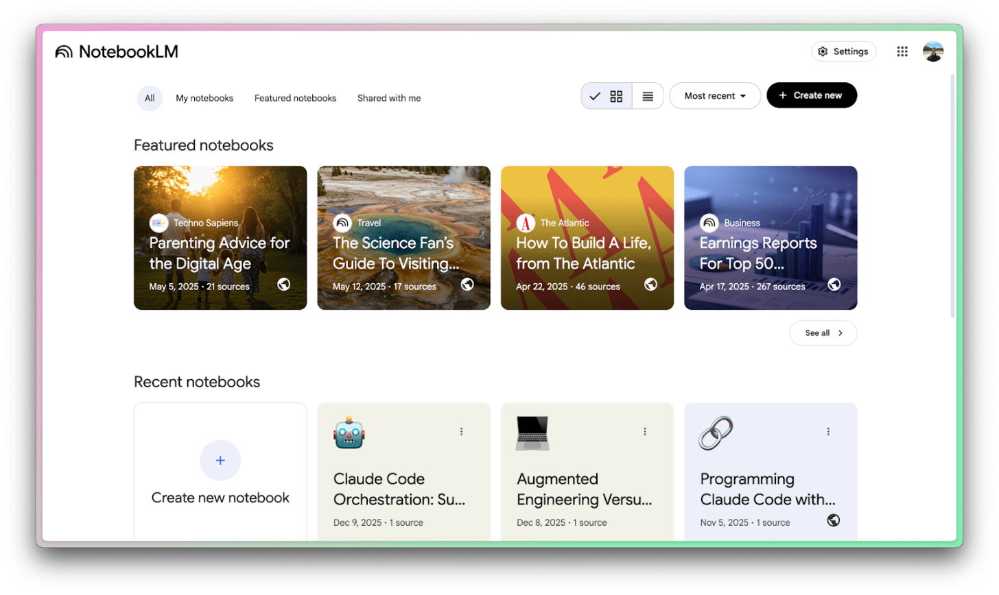 NotebookLM is more than a learning tool. It’s a research intelligence system. If you’re trying to get new information into your brain for any reason, you should be reaching for it. It’s a great way to collect and synthesize information. The tool is powered by Gemini under the hood, and you can connect it to the Gemini app (we’ll talk more about that later).