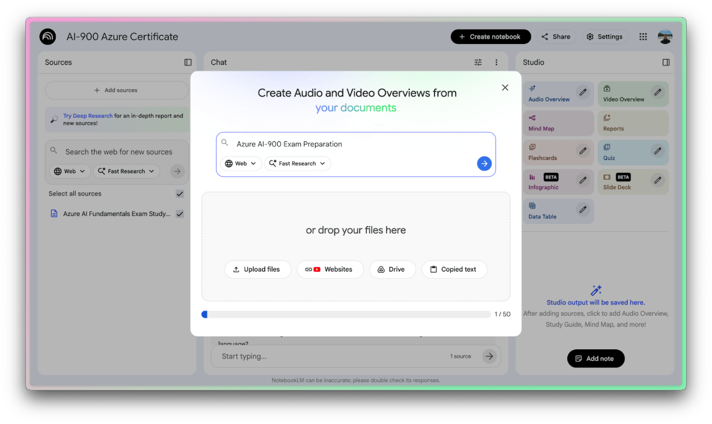 Since I’m currently studying for my Azure AI-900 certification, we’ll use my study materials as our example! There are two ways to get information into NotebookLM: