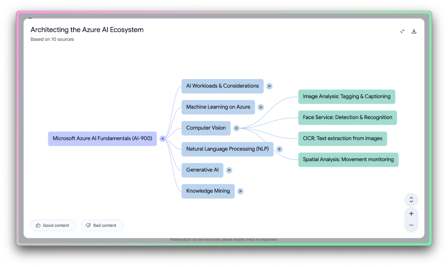 Mindmaps are a useful way to explore concepts, especially early on in the learning process. It’s a great way to get a feel for how terms relate to each other, as well as understand what may need extra attention from you. This was a very early feature of NotebookLM, and you’re likely to find it very useful.