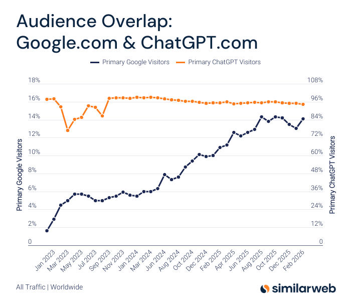 Simliarweb has a lot of recent data they have shared on this here (in mid March, 2026).