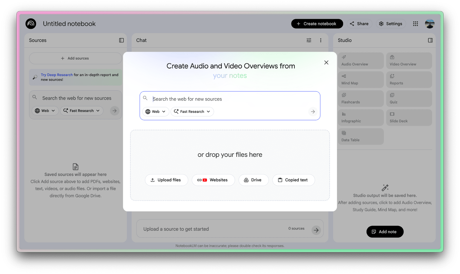 You can select “Fast Research,” and NotebookLM will do a web search and crawl for relevant materials, or you can do a “Deep Research” if you want the model to spend more time extracting insights from the sources it finds.