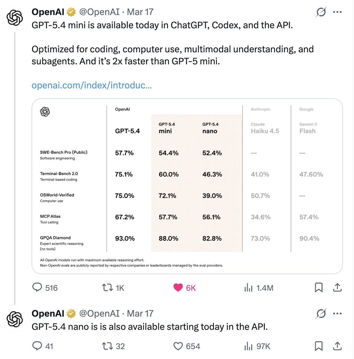 โก OpenAI launches GPT-5.4 mini and nano, delivering near-flagship performance in smaller, faster models built for coding and high-volume API tasks. (continue reading)