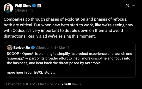 Editor’s Take: I’d say it’s fair to call this unsurprising —* OpenAI’s various bets (Sora, Atlas, Prism) seemed not to have paid off much, and their lack of focus on Codex no doubt hurt their ability to compete with Anthropic’s Claude Code / Cowork. As a big fan of Claude Code, i’m happy there is healthy competition in the space to make sure both Codex and Claude improve. Aside from that, i’m curious to see what this ‘Superapp’ might look like, assuming it ever actually does release.
