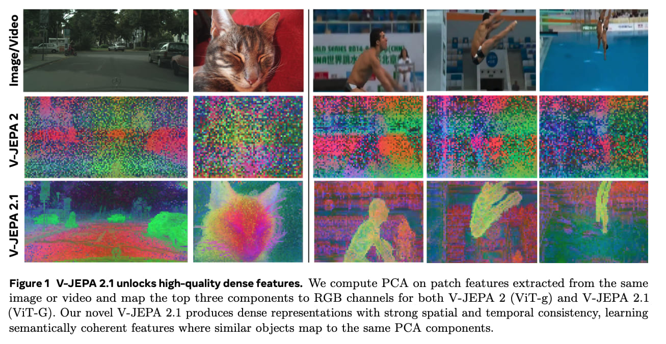V-JEPA 2.1: Unlocking Dense Features in Video Self-Supervised Learning. The authors train a unified image‑and‑video JEPA with a dense predictive loss applied to all tokens (and deep hierarchical supervision), producing higher‑quality spatio‑temporal dense features that improve forecasting, segmentation, depth, and robot planning performance.